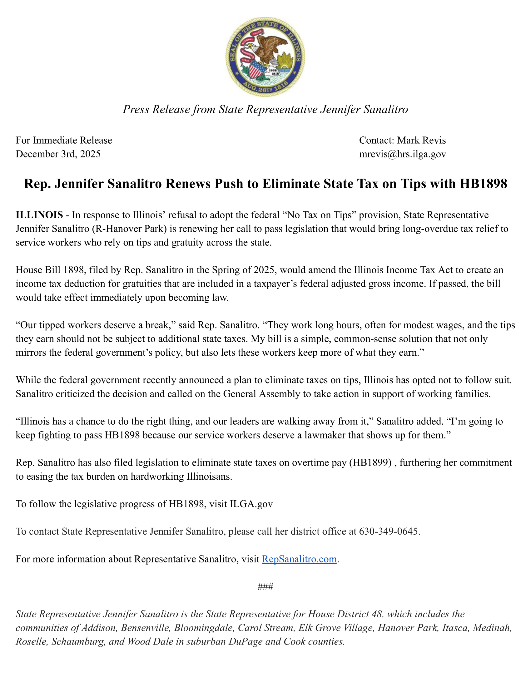 Rep. Sanalitro has also filed legislation to eliminate state taxes on overtime pay (HB1899) , furthering her commitment to easing the tax burden on hardworking Illinoisans.
